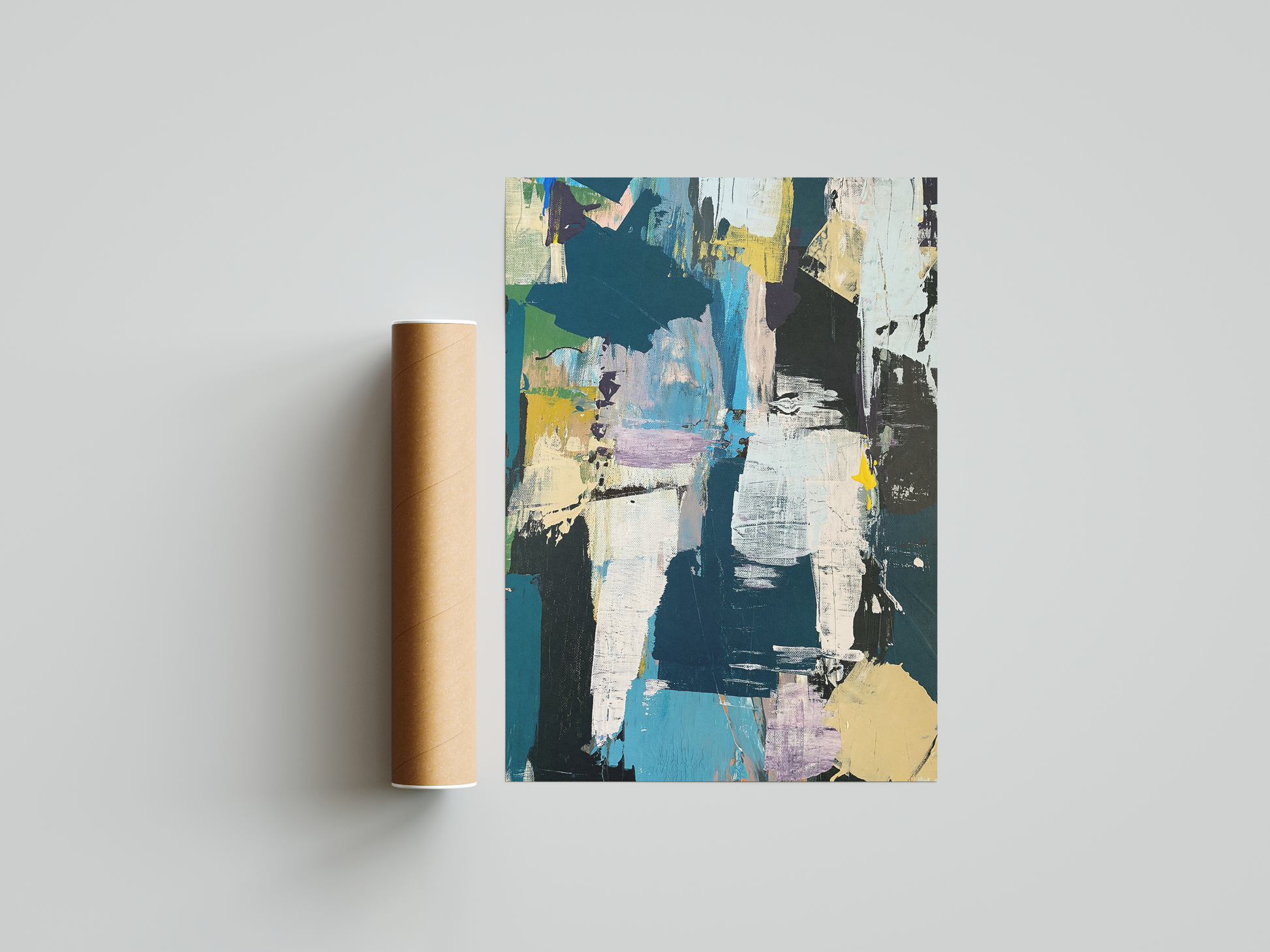 In this vibrant, abstract composition, the canvas seems alive with a dynamic surge of color. The hues rush across the surface, blending and clashing in an exhilarating display of movement. Swathes of crisp whites, electric blues, yellows, and purples collide and flow into one another, creating a tornado of energy that appears to spill out of the frame itself. The shapes are loose and organic, with no strict boundaries—just the free-flowing intensity of emotion and creativity.