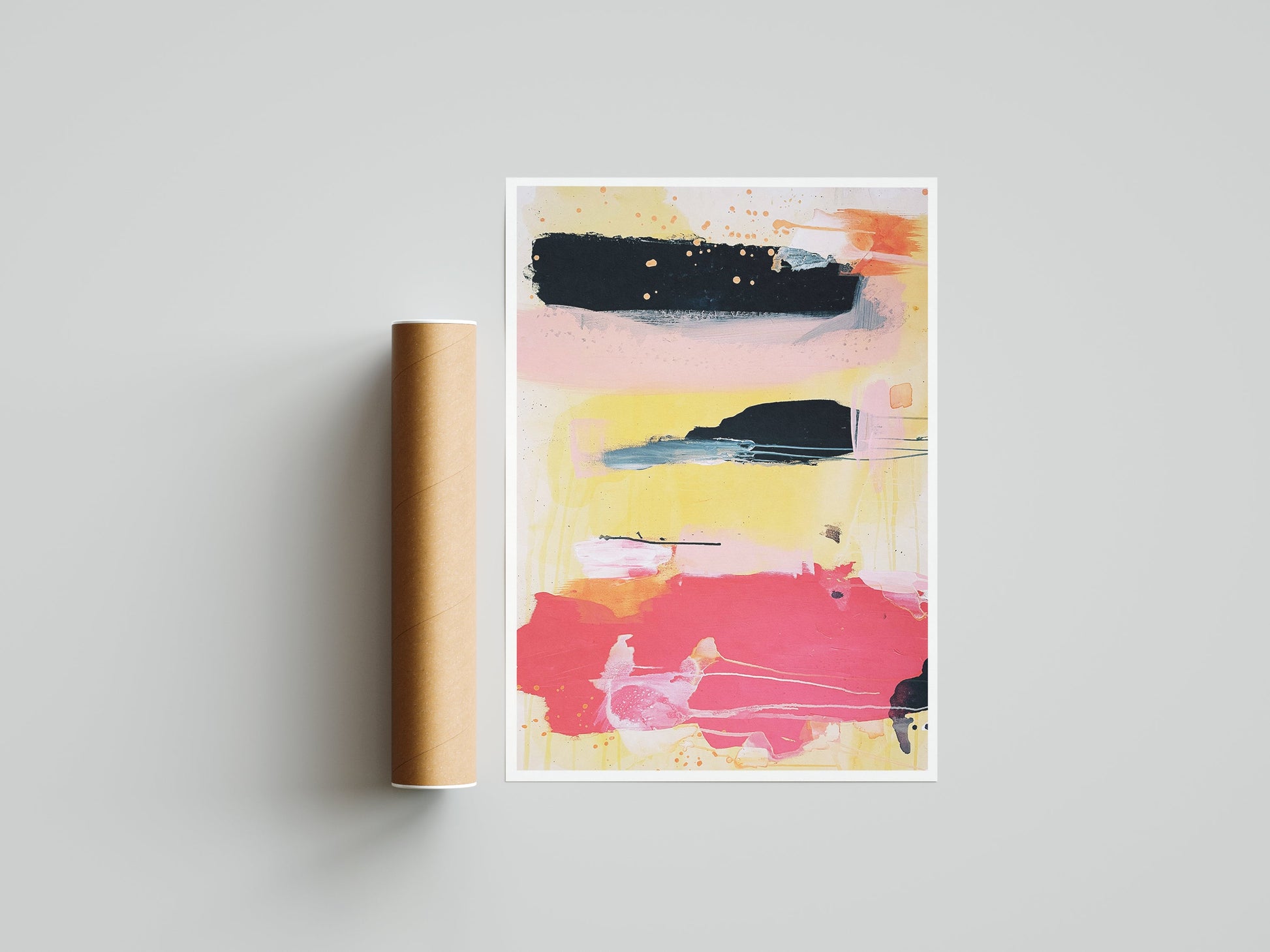 The canvas bursts with energy, where bold streaks of pink, yellow, white, and black sweep across the space in an energetic and almost chaotic dance. The pink adds a softness and warmth, like a blush of feeling or a tender moment, while the yellow introduces an explosive burst of optimism, brightness, and movement. The white streaks weave through the composition like a breath of fresh air, adding moments of clarity and space amidst the intensity. Meanwhile, the black streaks anchor the composition, adding depth, contrast, and a sense of mystery—perhaps even suggesting the weight of unspoken thoughts or the shadows of emotions.