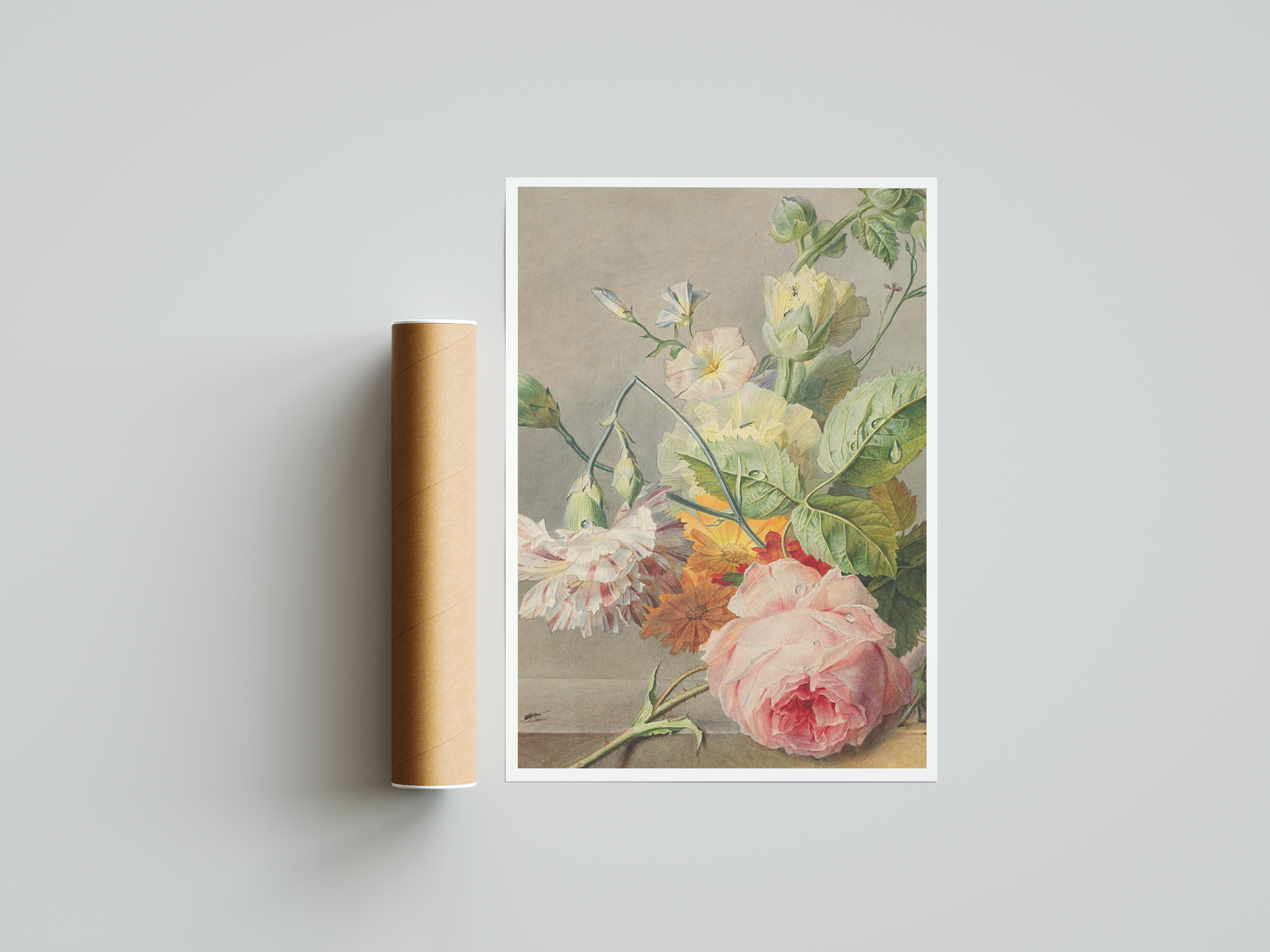 A painting of white and pink roses on a table evokes an air of elegance, romance, and timeless beauty. The delicate petals of the roses, combined with the peaceful simplicity of a table setting, create a scene that is both serene and inviting. The contrast between the soft whites, blush pinks, and the setting in which they are placed, can speak to themes of quiet beauty and gracious living.
