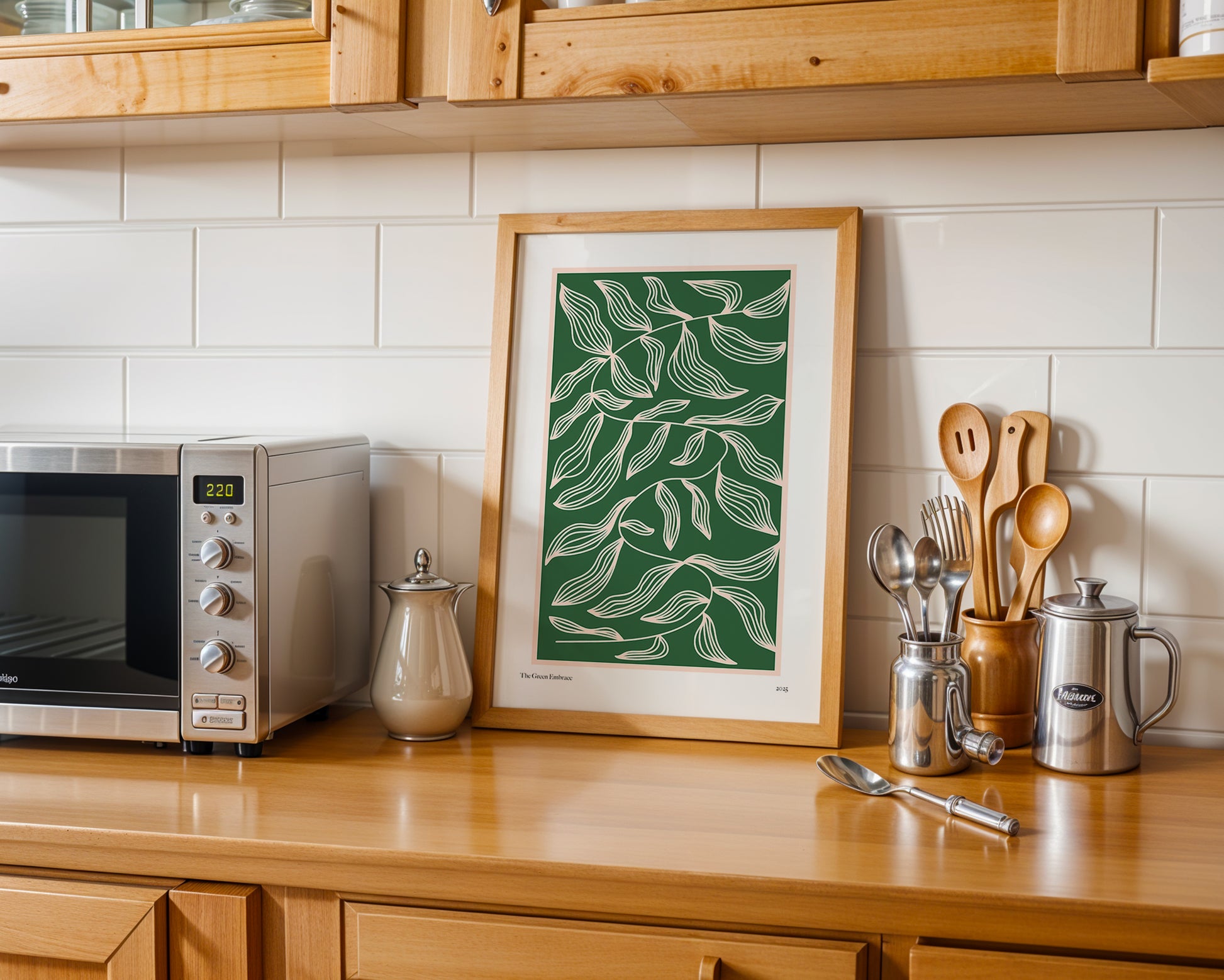 In this illustration, leaves intertwine and unfold against a rich green backdrop, creating a visual expression of nature’s gentle embrace. Each leaf, with its delicate veins and organic curves, seems to reach out and cradle the space around it — a quiet celebration of life, growth, and connection.