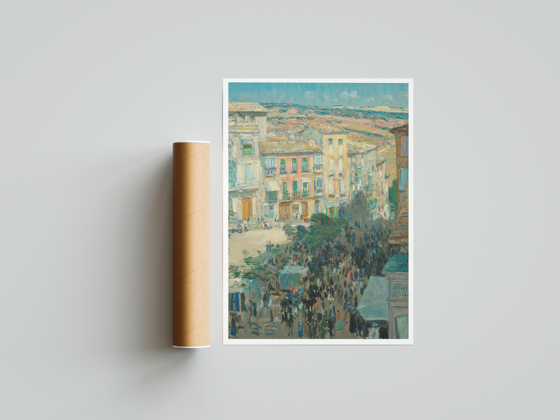 This cityscape painting art print would feature a view of a bustling city with a focus on its architectural marvels, vibrant energy, and contrasts between light and shadow. The colors could range from the bold hues of the sunset reflecting off buildings to the deep shadows of quiet alleys and streets, capturing both the movement and stillness that coexist in urban life.