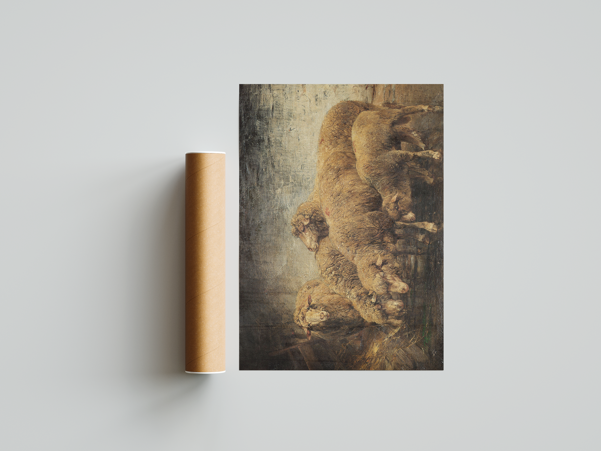 This charming art print depicts a cozy sheep family, their thick, fluffy wool creating a soft, textured scene full of warmth and tenderness. The composition highlights the gentle connection between the animals, inviting a sense of calm and pastoral serenity. Perfect for lovers of farm life, rustic charm, or heartwarming animal art.