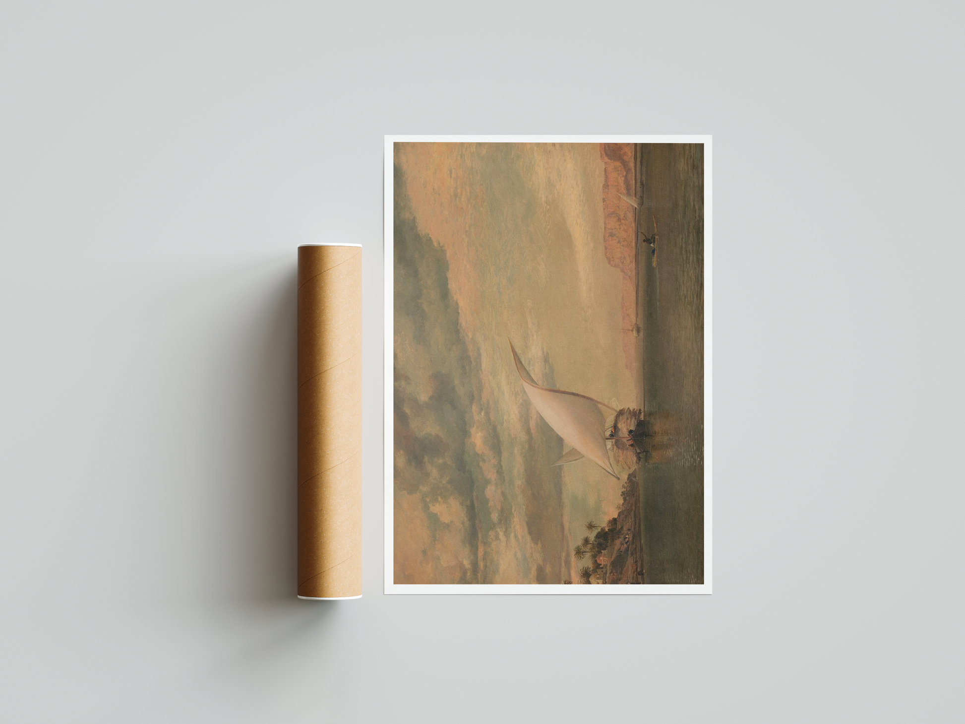 This art print would capture the quiet grace of a traditional boat floating down the Nile River against a backdrop of sand dunes and palm trees. The play of light on the water, combined with the warm, earthy tones of the desert landscape, creates a sense of peace, reflection, and timelessness. The boat itself is painted with delicate brushstrokes, its sail billowing gently in the wind as it moves along the water.