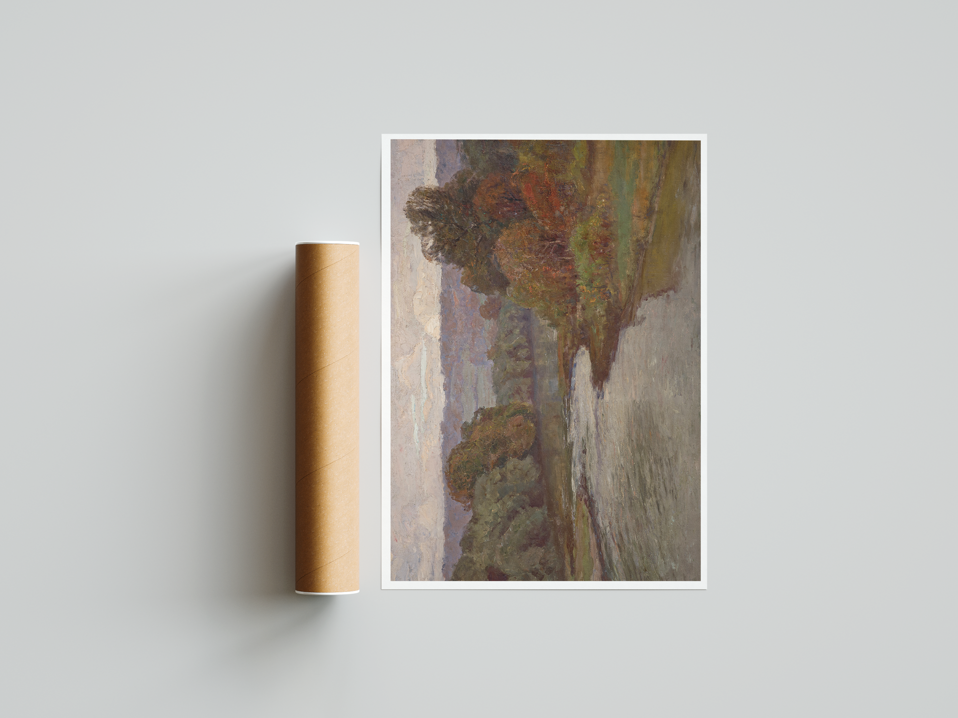 This art print depicts a classic countryside landscape, filled with rolling hills, and wide-open space. The colors are warm and inviting, with subtle variations of golden yellow, rustic red, burnt sienna, and earthy greens. The atmosphere is one of calm and simplicity, ideal for creating a relaxed, welcoming space.