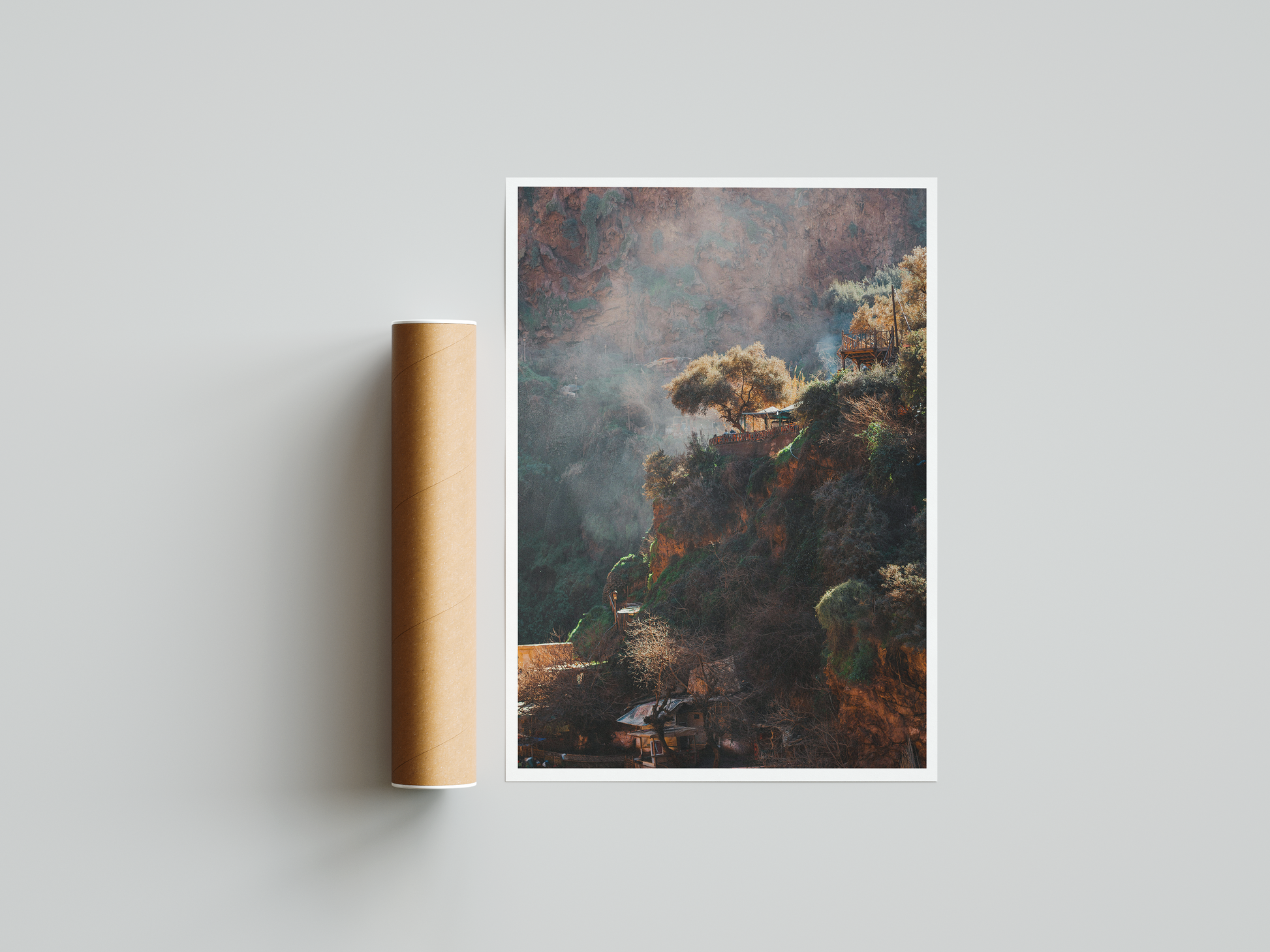 This art print captures the essence of fantasy landscapes grounded in realism — a harmonious blend of forest, mountain, and shelter that invites the viewer to step into a world of quiet wonder and reflection.