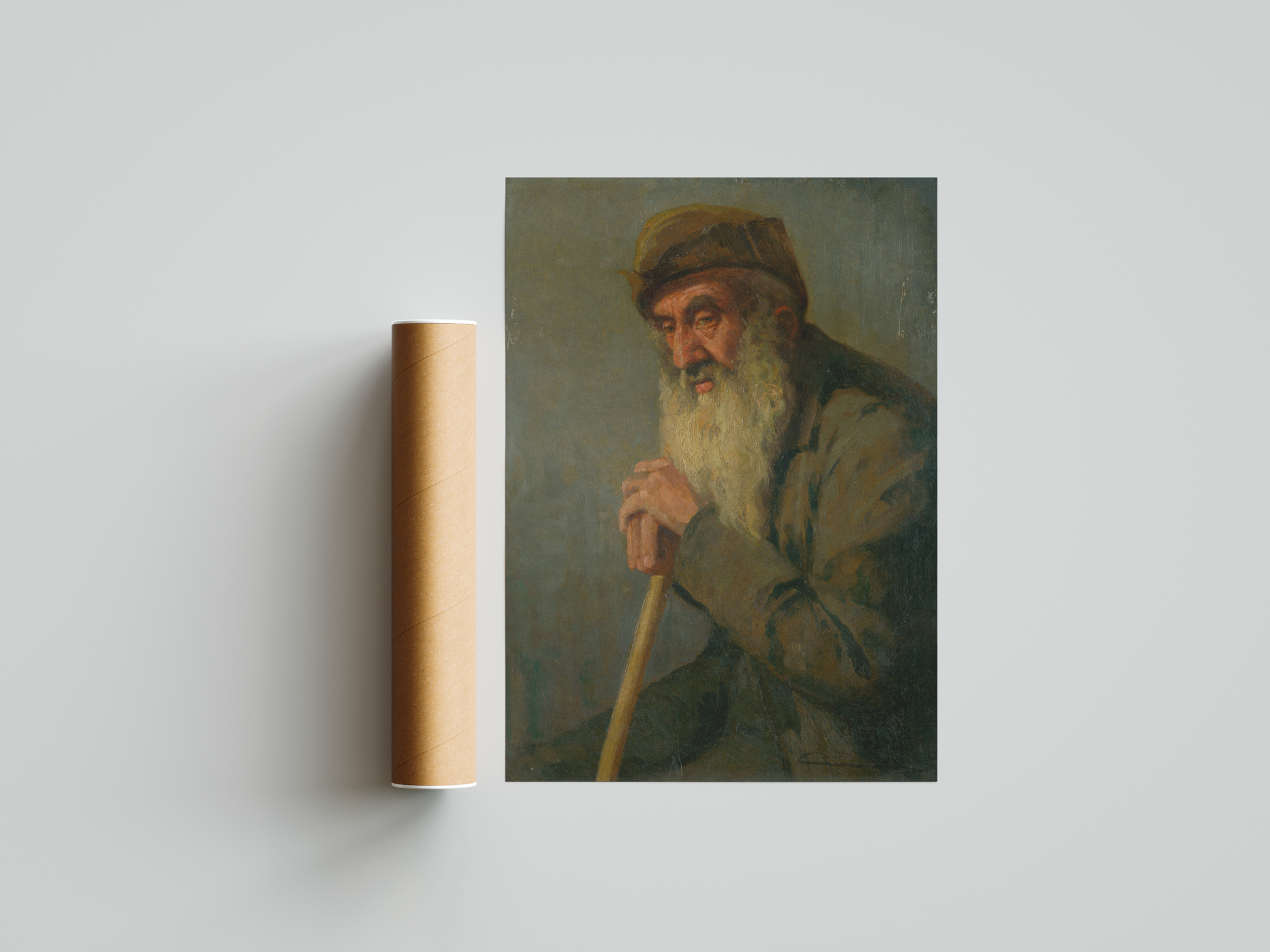 This artwork captures a quiet, reflective moment of an elderly man resting his hands on his walking stick, his body slightly bent, as if the weight of time and experience has naturally settled into his posture. His hands, aged with wrinkles, are gently gripping the smooth wood of the cane—each line and crease telling a story of years lived and lessons learned. The walking stick, perhaps worn with age and use, symbolizes both dependence and strength, as it supports his weary body while also representing his enduring resilience.
