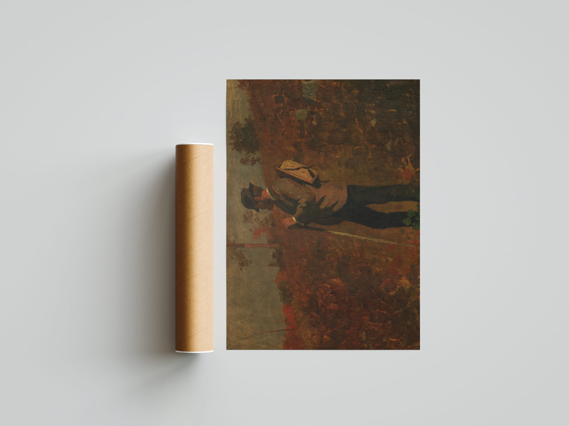 In this artwork, the man is dressed in a smart, well-fitted suit, with tailored trousers, a crisp shirt, and tweed jacket, maintaining a sense of classic style. The bowler hat, perched jauntily on his head, completes the ensemble, adding a touch of personality and timeless sophistication to the otherwise rugged outdoor setting. His outfit in earth tones—dark greens and browns —blending both elegance and practicality, suitable for the hike but still hinting at a well-curated sense of style.