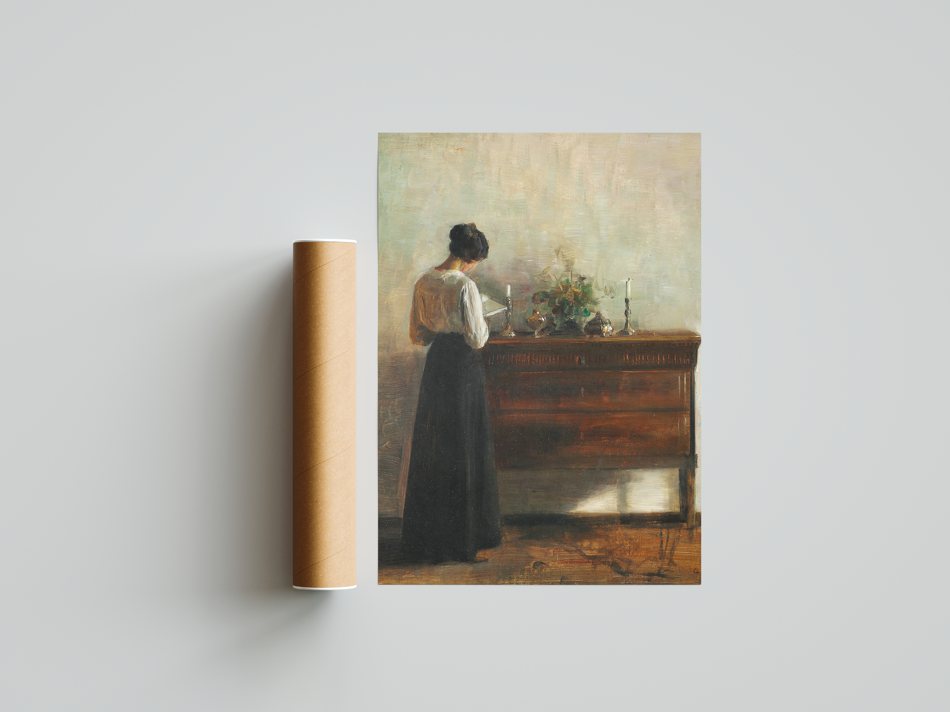 In this artwork, the woman is standing at a simple, rustic brown table— a weathered wooden table that bears the marks of time, evoking a sense of warmth and nostalgia. She is dressed in modest, slightly old-fashioned clothing. Her attire, while unadorned, exudes a quiet elegance through its simplicity. The soft fabric of her dress might have subtle folds or creases, emphasizing the natural flow of the material and her connection to her surroundings.