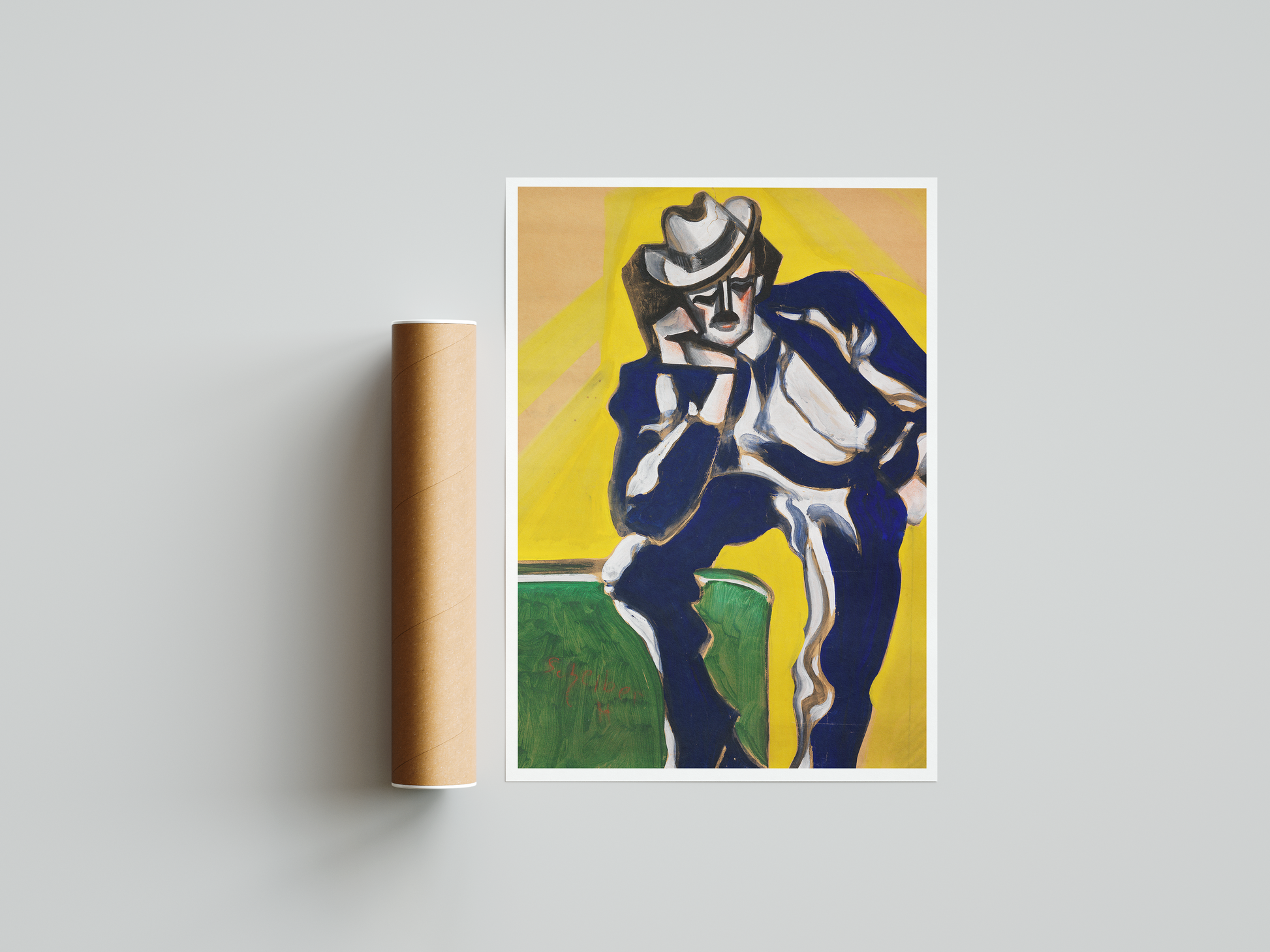 The man in the suit sits at the center of the composition, with a confident, yet relaxed posture. His stance is relaxed and casual, exuding a sense of modern sophistication. The suit is tailored, but it isn’t the main focal point; instead, the color palette of the surrounding composition plays a crucial role in the dynamic appeal of the piece.