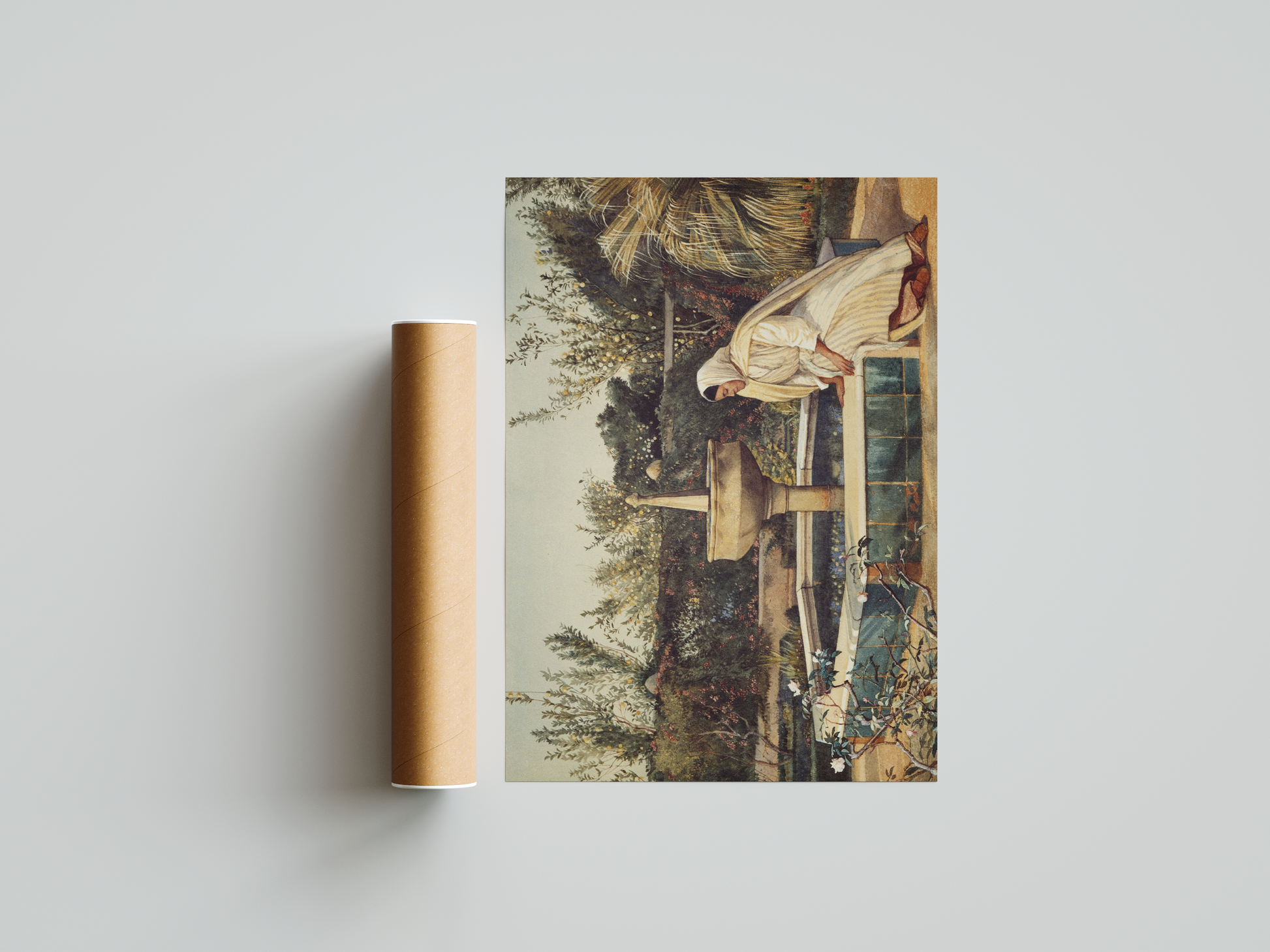 The painting evokes a sense of serenity and contemplation—a quiet moment of stillness in a garden that seems suspended in time. There is a sense of elegance and peace in the woman’s presence, as though she is in perfect harmony with the world around her. The soft trickle of the fountain and the vibrant blooms of the garden suggest a balance between nature, architecture, and human grace.