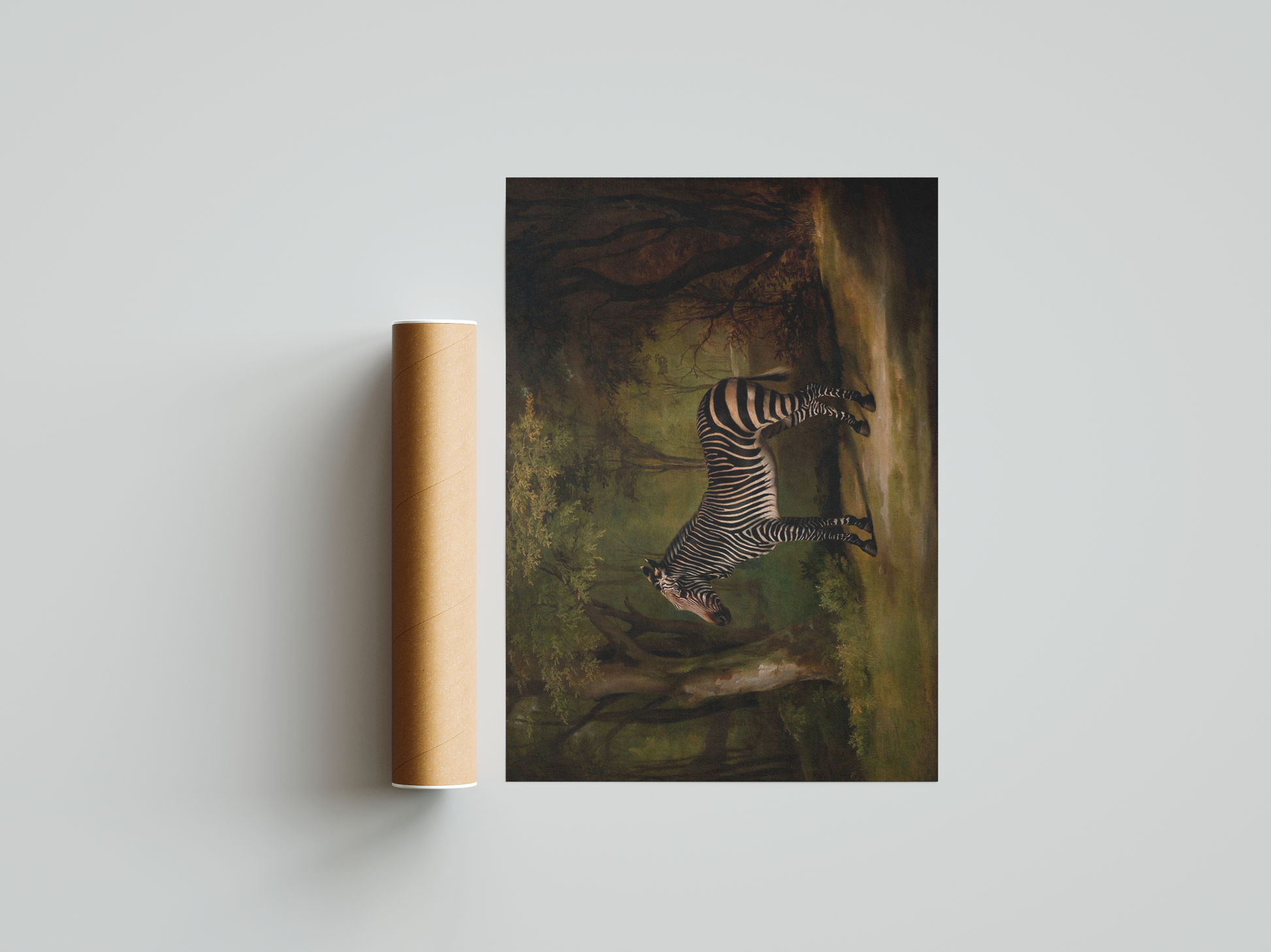 The artist masterfully balances the zebra’s graphic patterns with the fluid, organic forms of the trees, leaves, and vines that surround it. The dark green hues of the forest are punctuated by dappled light filtering through the canopy, casting soft, shifting patterns across the zebra's coat. The starkness of its stripes contrasts beautifully with the softness of the forest, creating a visual harmony between the creature and its environment.